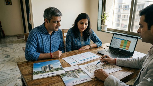 The property buying process reaches a point where most buyers experience a situation which requires them to make a decision between two remaining choices. Property A feels premium because it sits in a region which shows rapid development. Property B offers extra space at a lower price point because it requires users to travel to a more distant location. The family members show divided opinions. The friends provide opposing guidance. The sales teams apply strong pressure to their customers. The process of making an exciting choice becomes a mental challenge. The entire country of India experiences this phenomenon when you compare two apartments in Bengaluru or Mumbai which are both Tier 1 cities and conduct a villa versus apartment assessment in Tier 2 cities like Jaipur and Coimbatore or select between plotted developments and houses in Tier 3 towns. To conduct an unbiased assessment of two properties requires a standardized evaluation procedure. The absence of this system results in emotional control over the situation. The guide presents a method which enables you to assess the two properties through a systematic approach to decision making that provides you with clear understanding for your upcoming decision. The process needs to be made simpler.