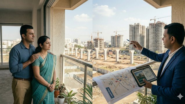 Two buyers evaluate properties in Pune. The first buyer chooses a small apartment in a crowded area close to their current office. The second buyer chooses a development region apartment which has a size that exceeds their current apartment. Five years later, the metro became operational. The second buyer enjoys better connectivity, higher property value, and improved infrastructure. The first buyer experiences both traffic problems and restricted ability to sell his property. Both buyers purchased homes-but only one considered the perspective of their future self. These real-life scenarios demonstrate the crucial importance of long-term thinking in property decision-making processes.