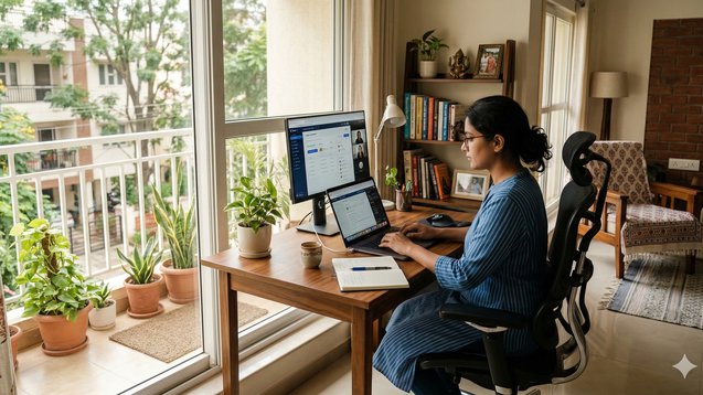 The process of working from home appears simple to people who have not experienced its actual challenges. The combination of video calls and household sounds creates difficulties. The limited area causes cognitive exhaustion. The meeting process gets interrupted by insufficient internet connections. The small problems which occur during work time will develop into major challenges for both productivity and work-rest periods after extended time periods. Traditional Indian homes were designed to accommodate family living spaces which functioned as their primary purpose while lacking spaces that met actual professional needs. The design of compact apartments in Tier 1 cities focuses on achieving maximum unit density throughout their entire building area. The Tier 2 and Tier 3 cities provide space availability conditions which differ from the planning and infrastructure quality standards which exist in different areas.